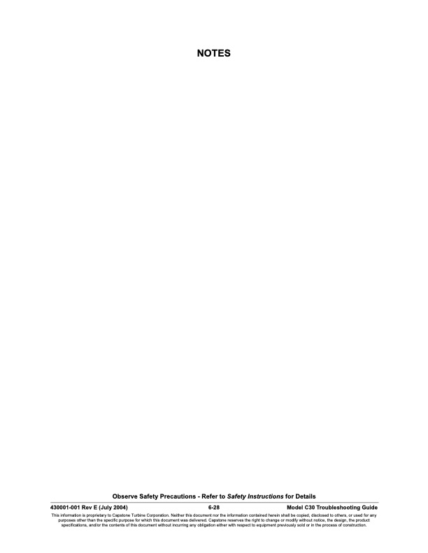 NOTES Observe Safety Precautions - Refer to Safety Instructions for Details 430001-001 Rev E (July 2004) 6-28 Model C30 Troubleshooting Guide This information is proprietary to Capstone Turbine Corporation. Neither this document nor the information contained herein shall be copied, disclosed to others, or used for any purposes other than the specific purpose for which this document was delivered. Capstone reserves the right to change or modify without notice, the design, the product specifications, and/or the contents of this document without incurring any obligation either with respect to equipment previously sold or in the process of construction.PDF Image | SERIES 5000 FAULT CODES Package Faults